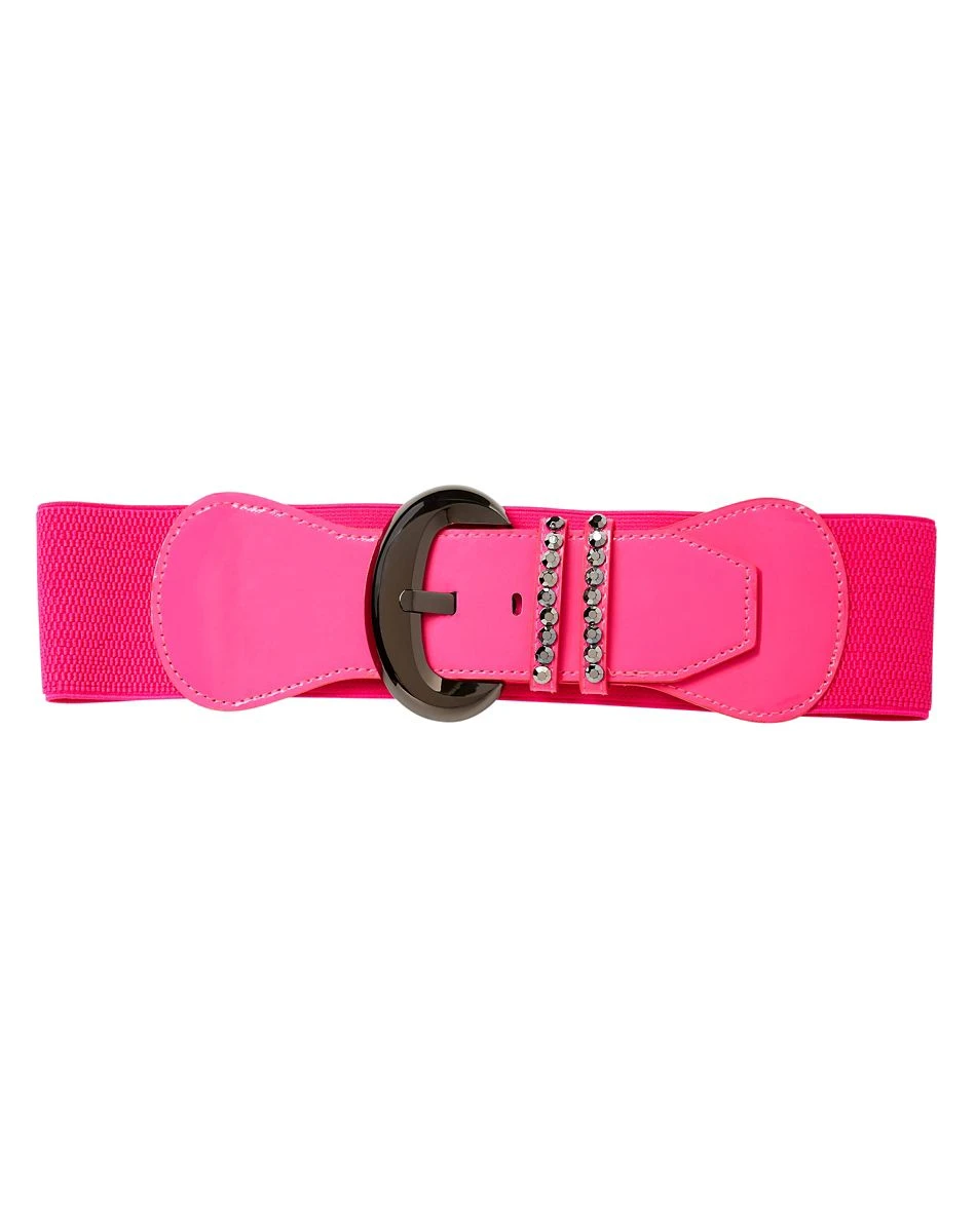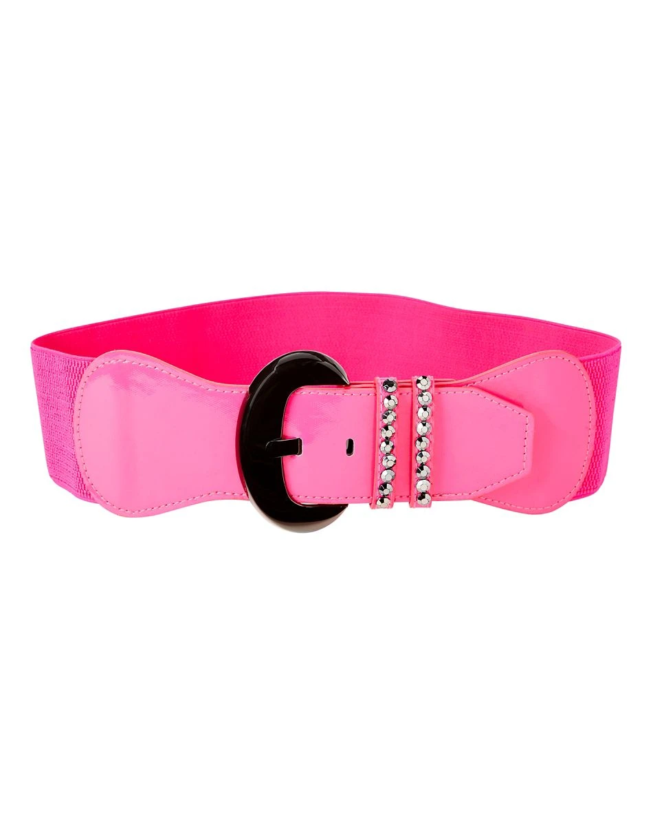 Transform yourself into an ’80s dancing queen with this neon pink belt! This bright belt offers generous stretch as well as three adjustable sizing options. Rhinestones add a hint of sparkle to this eye-catching statement piece.