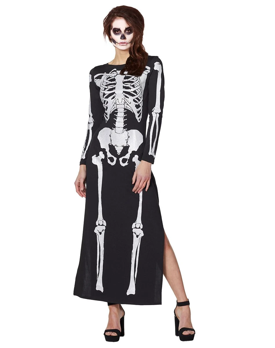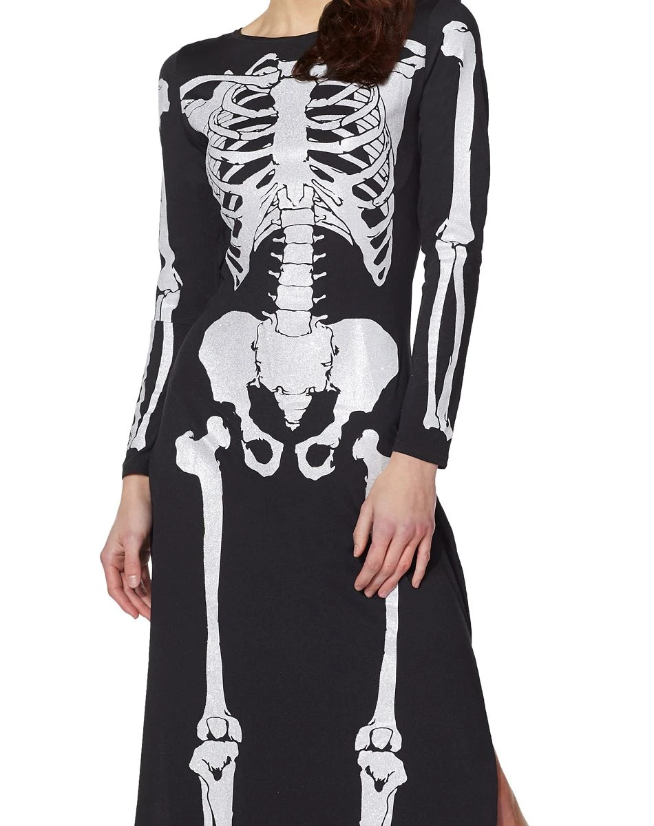 Whatβs spookier than a skeleton? Youβll bring a scare to the party in this skeleton maxi dress covered in glitter detail. This dress will turn you into a bag of bonesβin a good wayβand willΒ definitely make you bad to the bone.