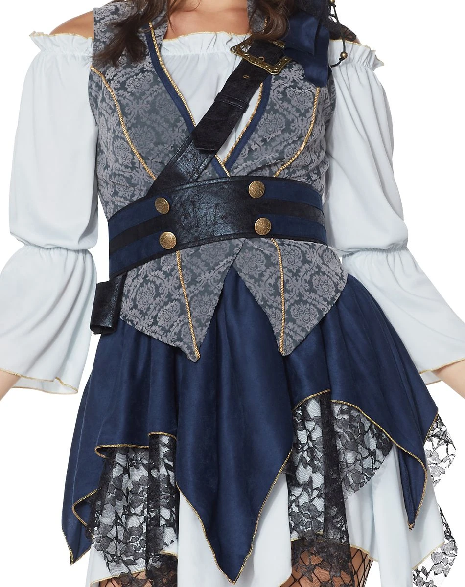 From Our Exclusive Signature Collection. Way out in the uncharted waters of the worldβs high seas comes the Castaway Beauty Pirate Costume. Before you know it, youβll be a plundering, treasure hunting, dangerous pirate with looks to spare. This costume comes in extraordinaryΒ detail from the hat and headband, all the way down to your weapon. All of this detail will have you looking like you just dug up buried treasure wherever you go. Plunder the high seas in this costume from our signature collection.Β