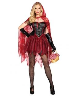 Show that wolf who’s boss in this dangerous red riding hood costume! This sultry red riding hood costume features a corset-style bodice with a tattered red skirt. A sheer, lacy red cape with an attached hood adds an elegant touch to this little red getup.