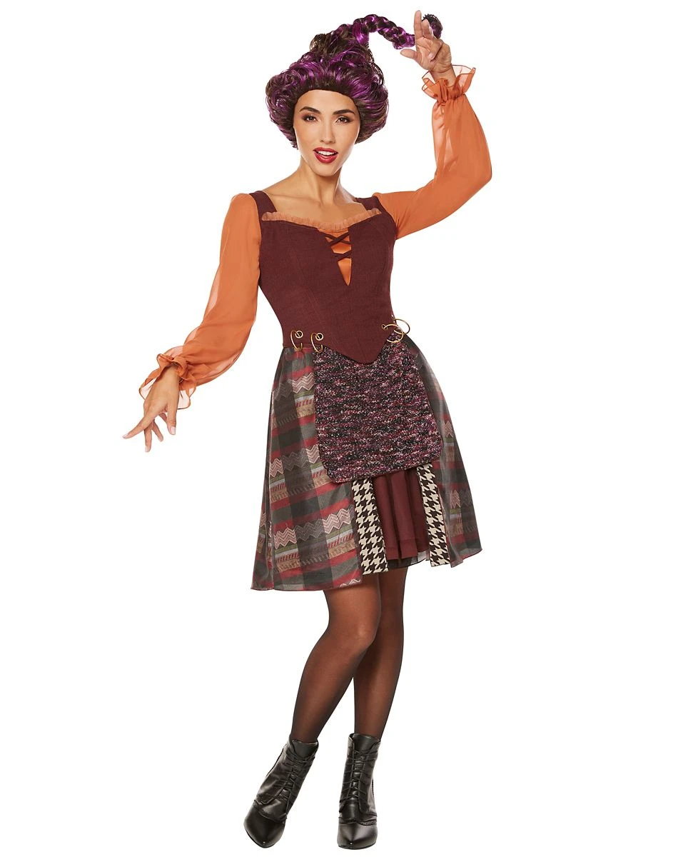 Conjure up some trouble on Halloween with this officially licensed Mary Sanderson dress from Disneyβs Hocus Pocus! Along with her sisters, Mary is back and ready for a night of fright! Maryβs signature maroon dress features intricate patterns and is adorned with goldtone hoops along the bottom of the vest. Spread some terror in Salem this Halloween with this villainous ensemble, available exclusively at Spirit Halloween.