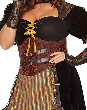 This Adult Steampunk Lady Plus Size Costume will instantly transport you into a scientific fantasy world of gears, goggles, and opulent Victorian influence! Puff sleeves and ribbons adorn a velvety black dress with an asymmetrical hemline. Lace detail completes the upper back area of the dress and pairs perfectly with matching lace glovettes. A top hat and goggles round out a look that is simply steampunk from start to finish!
