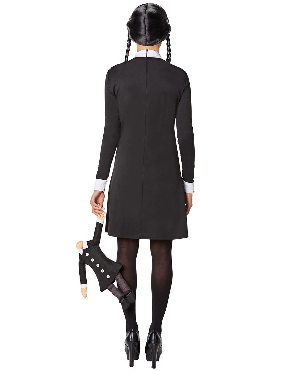 Wednesday’s child is full of woe! Transform into the sweet and spooky Wednesday Addams when you slip into this costume. Featuring a black dress with a white collar, white cuffs, and button details, you’ll feel like Wednesday Addams as soon as you put it on. Top off the look with black tights!