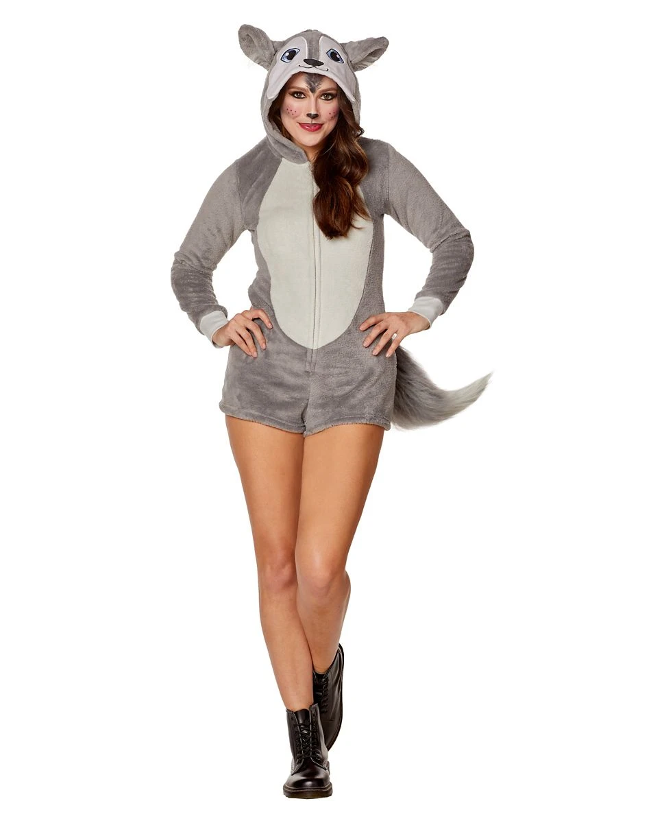 You’ll be howling with Halloween joy in this Adult Wolf Romper! Featuring a zip-up design with an attached wolf ear hood and fluffy tail, this gray plush romper is wildly cozy.