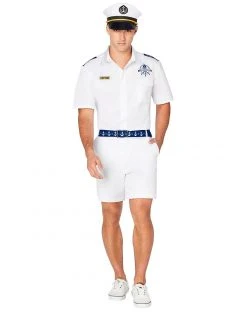 Prepare to navigate the seas with confidence in this ship captain costume! This nautical costume has all of the official markings of a captainβs uniform. A bright white button down shirt with a crisp collar, chest emblem, and shoulder accents pairs perfectly with matching shorts. An anchor print belt, captainβs hat, and name tag show that you belong at the helm of the ship!