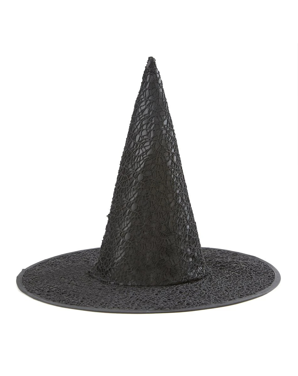 - The black Gothic Witch hat is covered with a black spidery net and has a lace cone and satin brim with contrast piping