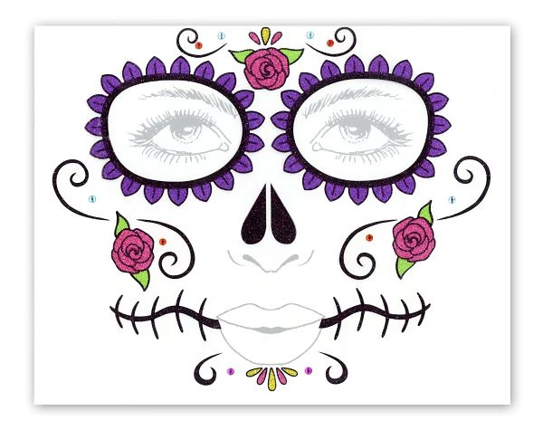 Instantly have a skull face with these Day of the Dead Decals! You don’t need makeup skills – just use this kit and you’ll have the signature flower eyes, skeleton nose and mouth, and cute flowers!