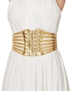 Add a flattering accent to your Roman costume with this Gold Roman Waist Cincher! This waist cincher features a front zipper closure and strappy gold details for an authentic look with a modern twist.