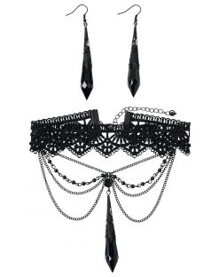 Embrace the beauty of darkness with this Gothic Jewelry Set! This set features a pair of stunning black crystal-effect teardrop earrings and a matching lace and chain choker necklace. Gloom is the new glam with this jewelry set!