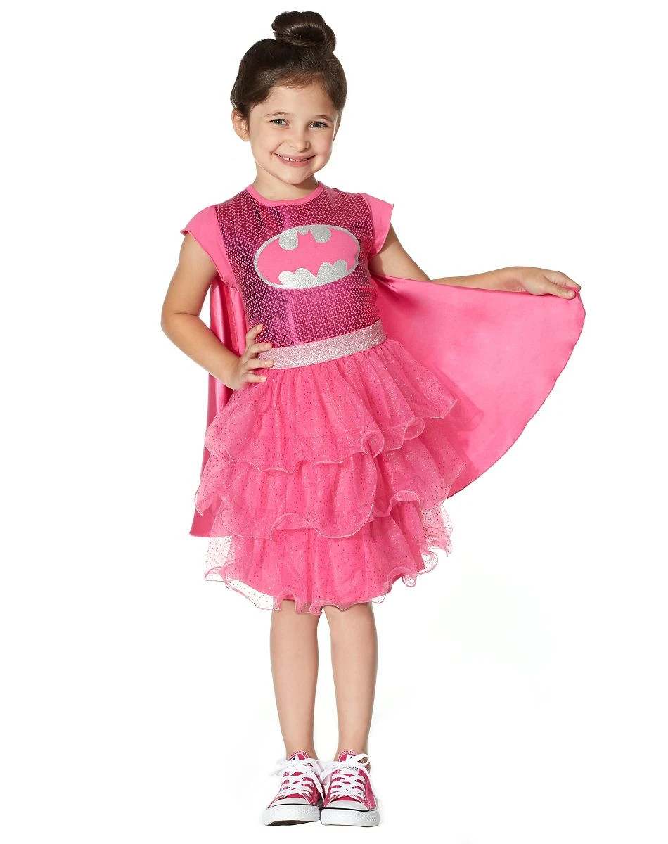 Get ready to take down supervillains in style with this pretty pink Batgirl costume! The shimmering top features an glitter Batgirl logo with a ruffled attached tutu! The attached cape finishes off this look to make you the most sparkling superhero on the block.