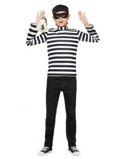 Freeze! Try not to get caught with your hand in the cookie jar as you show off your troublemaker side in this fun burglar costume! The shirt features classic white and black burglar’s stripes and the hat and eye mask are both completely black.
