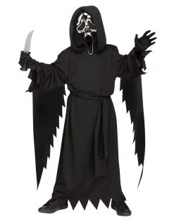 Make this a truly haunted, spooky Halloween when you dress up in this official Kids Chrome Ghost Face ® costume! With its black hooded robe, Ghost Face ® chrome mask and matching belt and gloves, you’re sure to scare up plenty of screams.
