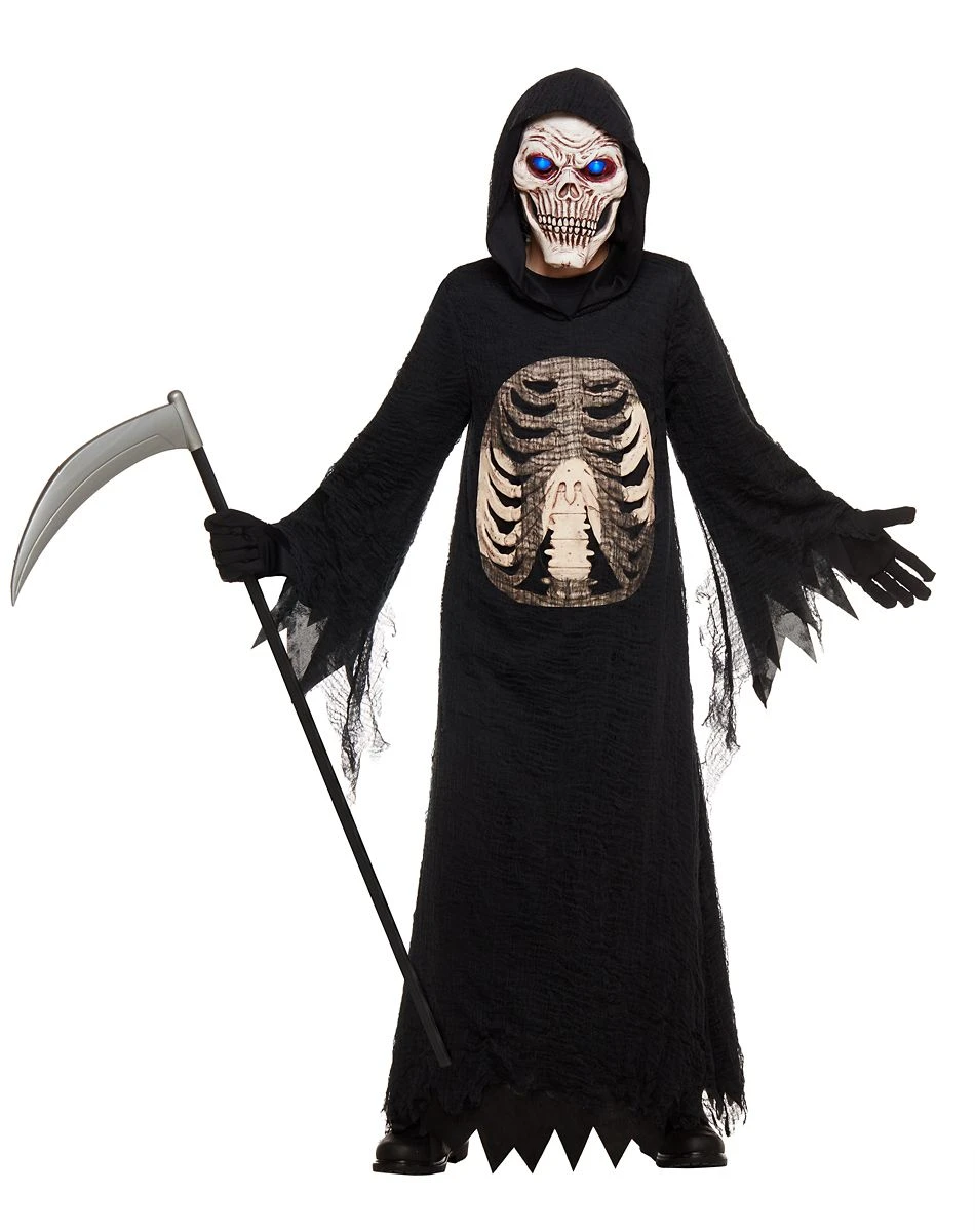 Haunt the night wherever you may go when you dress up in this kids Reaper costume. The long, black robe is tattered and features a rib cage in the center of the chest to create a skeletal effect–and the light-up mask is sure to make you stand out in the darkness!