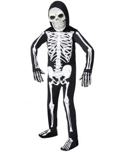This bone-chilling skeleton costume is a Halloween classic! This full-body jumpsuit features realistic bone graphics and an attached hood. Skeleton gloves and a terrifying mask make this bony ensemble a guaranteed hit.