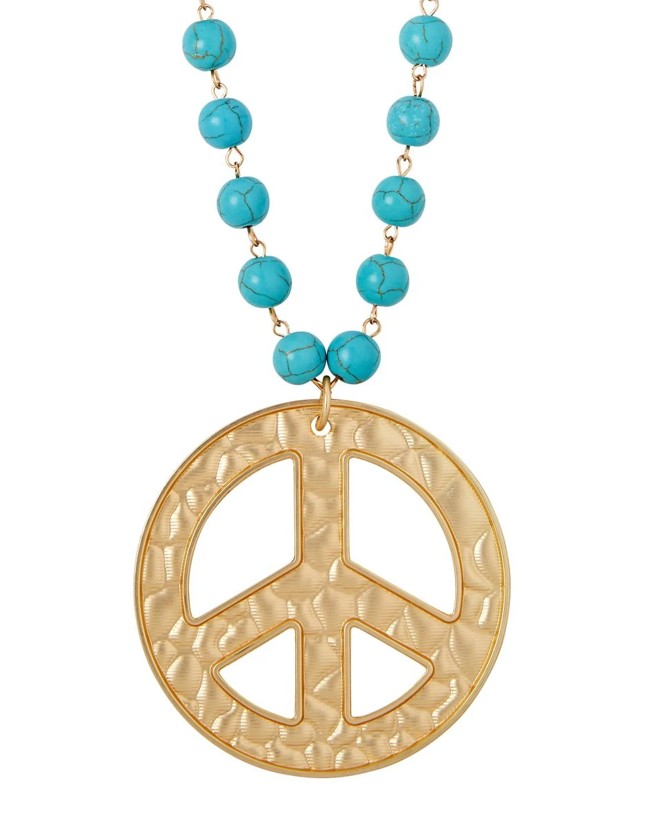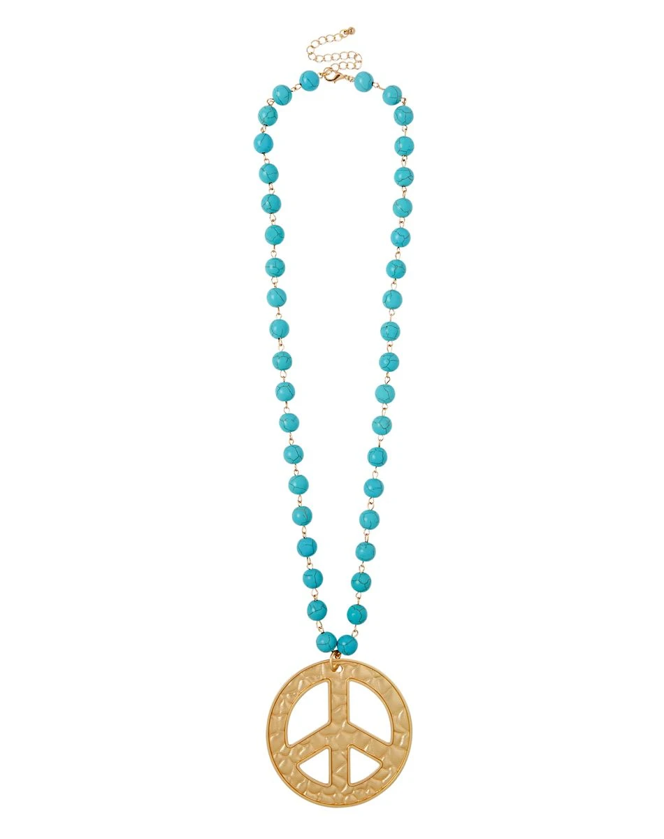 Feel totally groovy when you rock this fun 1960s-style peace sign bead necklace! With teal blue beads and a goldtone pendant, it’s the perfect accessory for any hippie or sixties outfit.