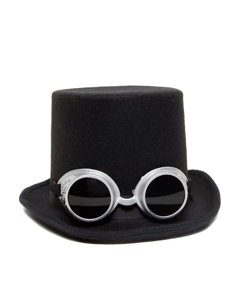 Complete your tech costume with this Steam Top Hat With Goggles! Go for a time warp with this black top hat with attached silver goggles.
