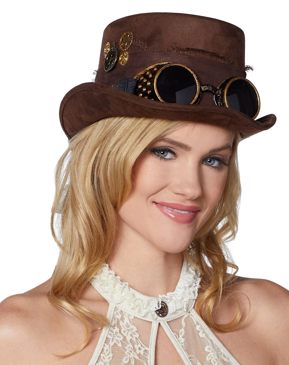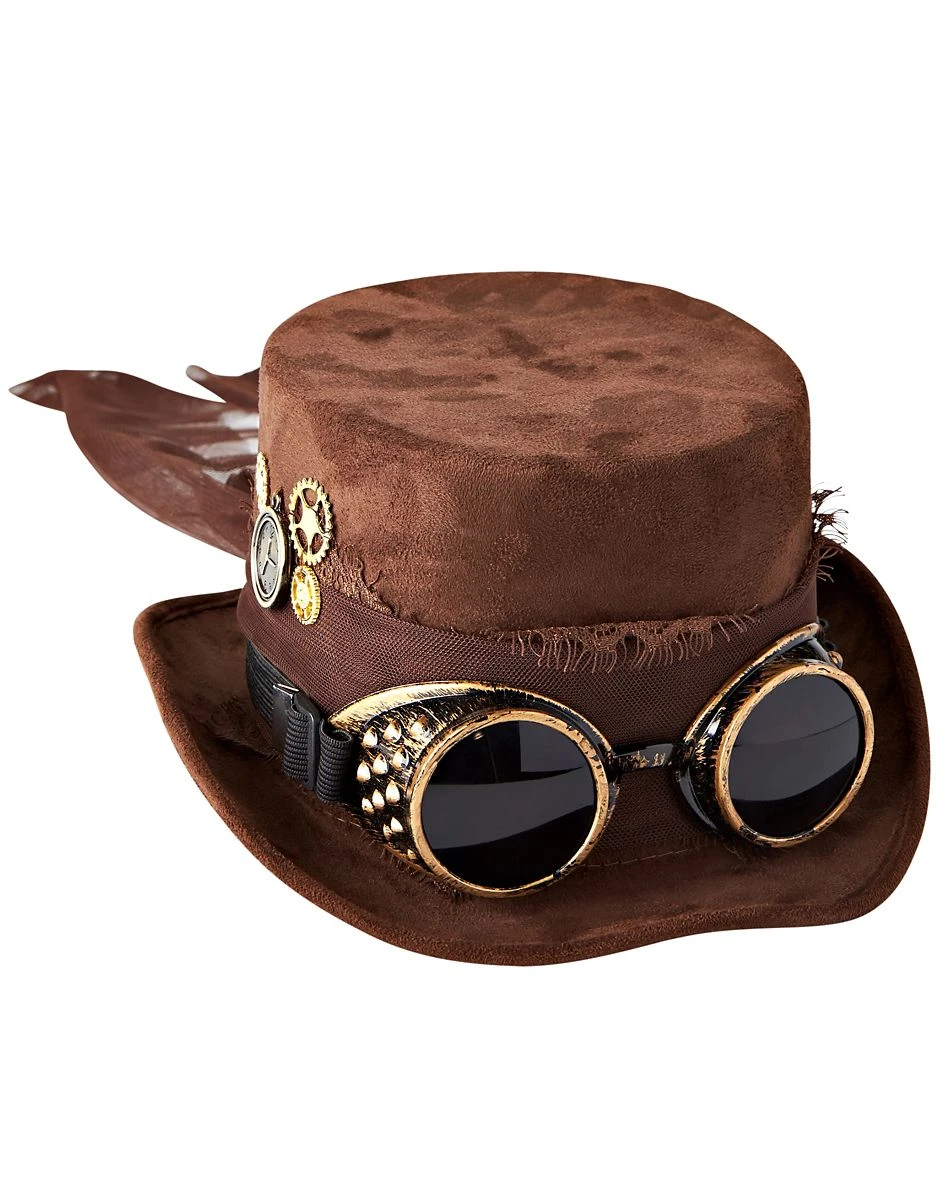Accent any retrofuturistic style with this steampunk top hat! The included goggles add another layer of vintage fun to this classy geared top hat.