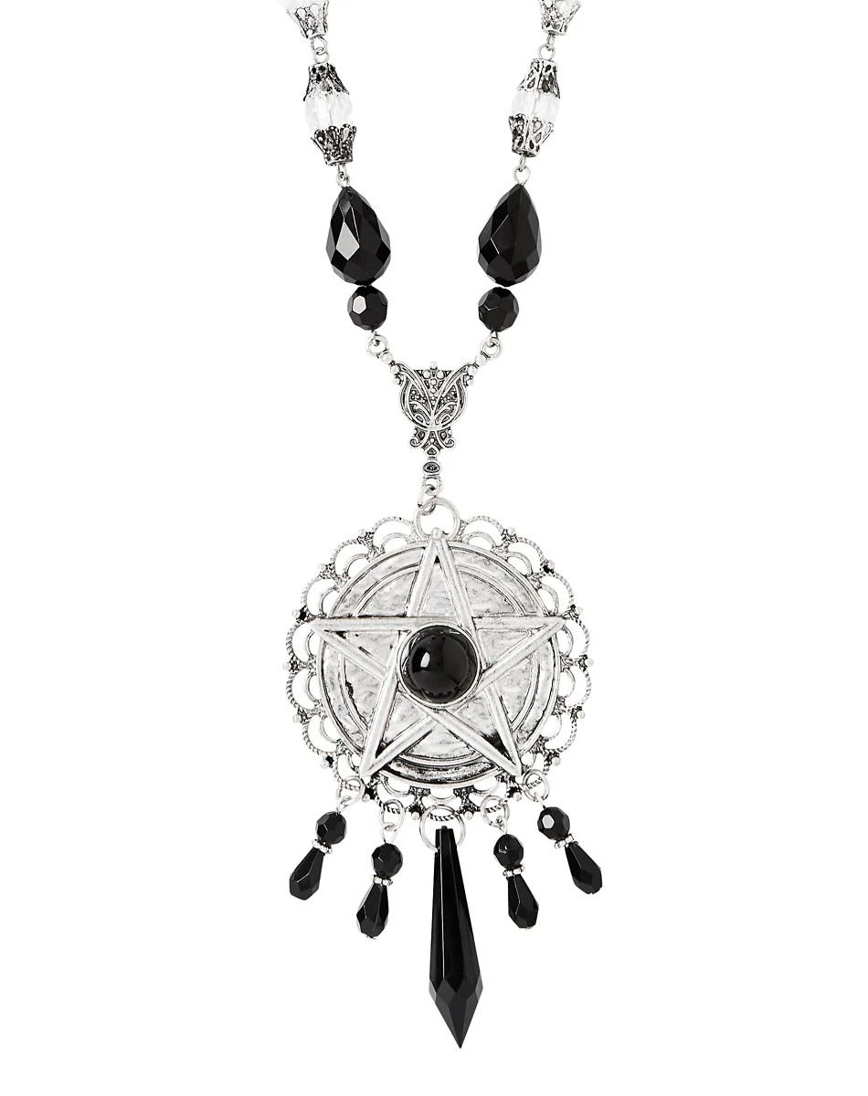 Add a touch of spooky elegance to your look with this Black and Silver Pentagram Necklace! This long, ornate necklace features an adjustable chain, a pentagram charm, and faux crystal accents.